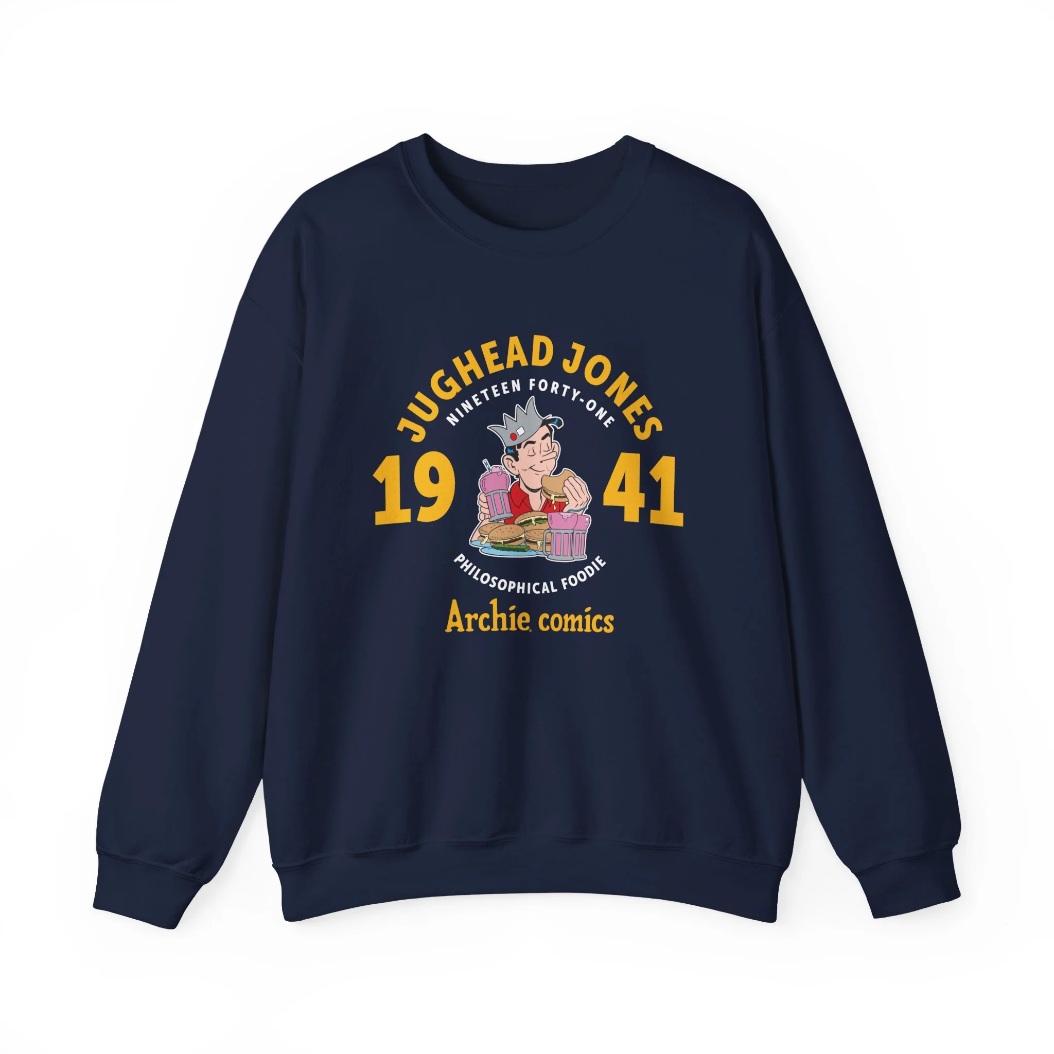 This sweatshirt showcases Jughead Jones in action, enjoying his favorite pastime — eating! Since 1941, Jughead has been delighting comic fans around the world with his quirky charm and insatiable appetite.